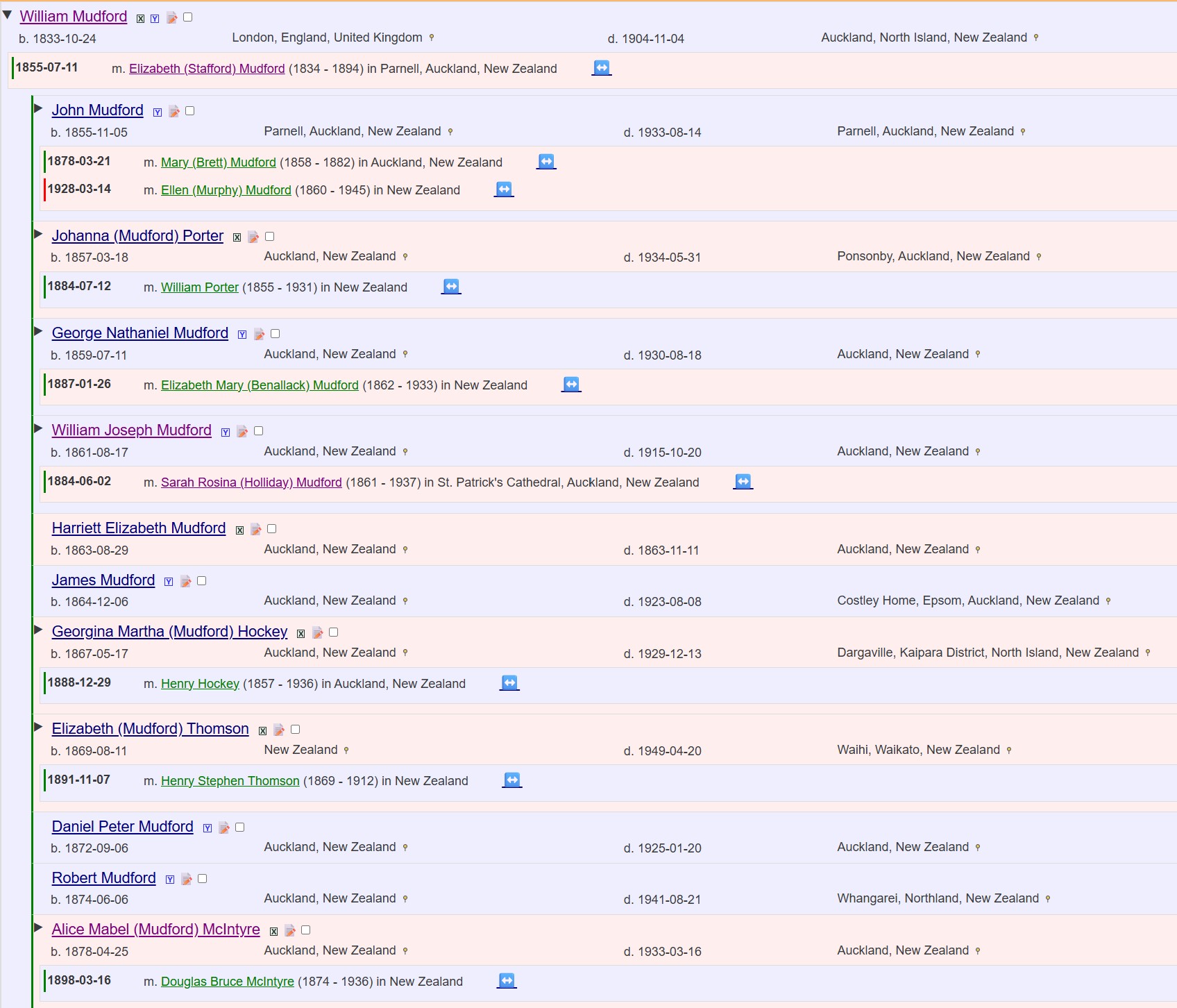 William died on 4 November 1904. He is buried in Symonds St. Cemetery, in a plot which also contains the graves of his mother Johanna (b. 1788) and his wife Elizabeth (Stafford) Mudford (b. 1834). William also has a profile on Find a Grave.