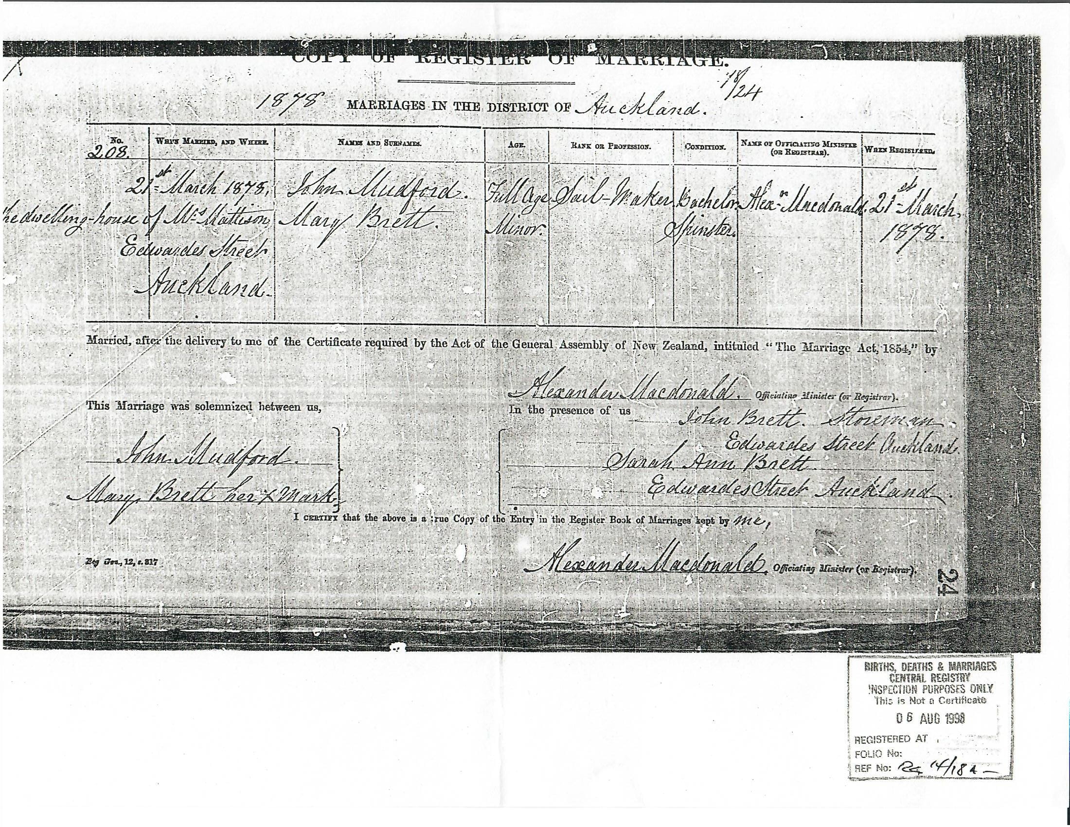 John married Mary Brett in 1878. There is a report of Mary assaulting John, and the charges being withdrawn after they went to the bench.