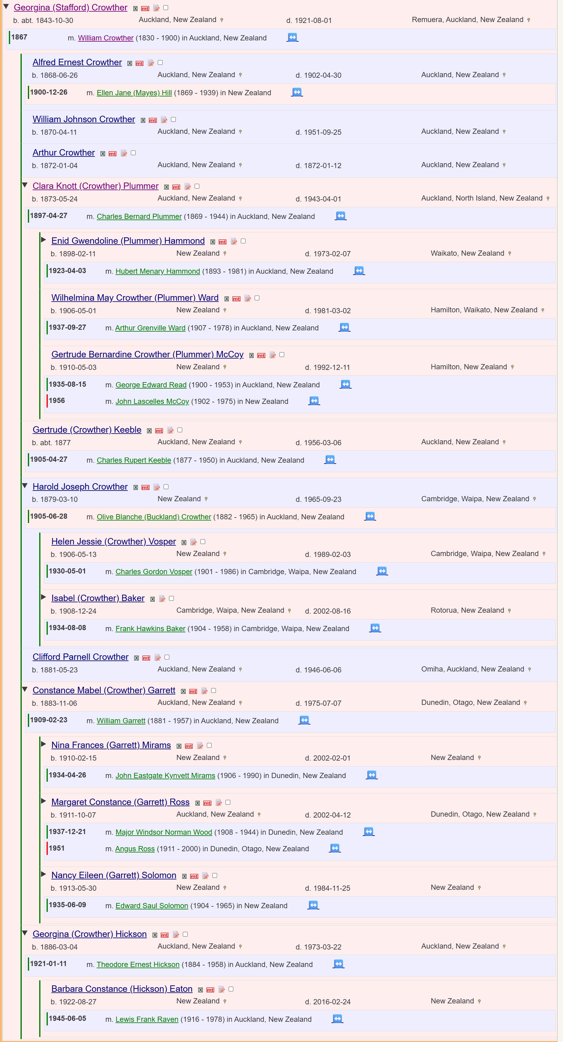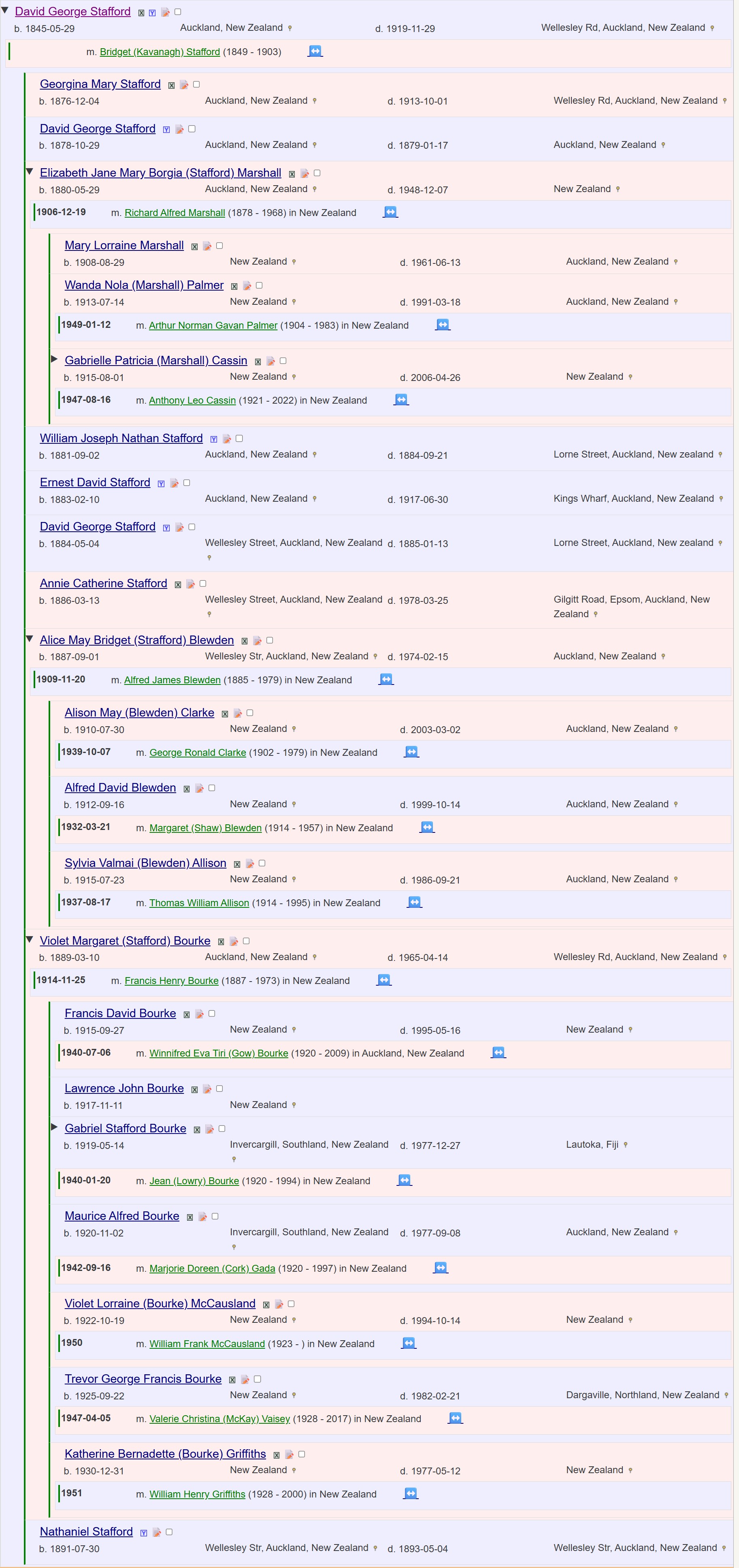 Nathaniel remarried later in 1841 to Mary Jane (Smith) Stafford. Nathaniel and Jane emigrated to Aotearoa with Elizabeth in 1842 on the Duchess of Argyle which sailed from Greenock, Scotland on 9 June 1842, and arrived in Auckland on 9 October 1842. It seems that the eldest son Joseph remained in England. However, he has not so far been found on any marriage, death or census records in England. Nathaniel and Jane had three children in New Zealand: Georgina (Stafford) Crowther, born in 1843, David George Stafford, born in 1845, and Nathaniel Stafford, born in 1847. Nathaniel died in 1888 apparently without marrying or having any children.