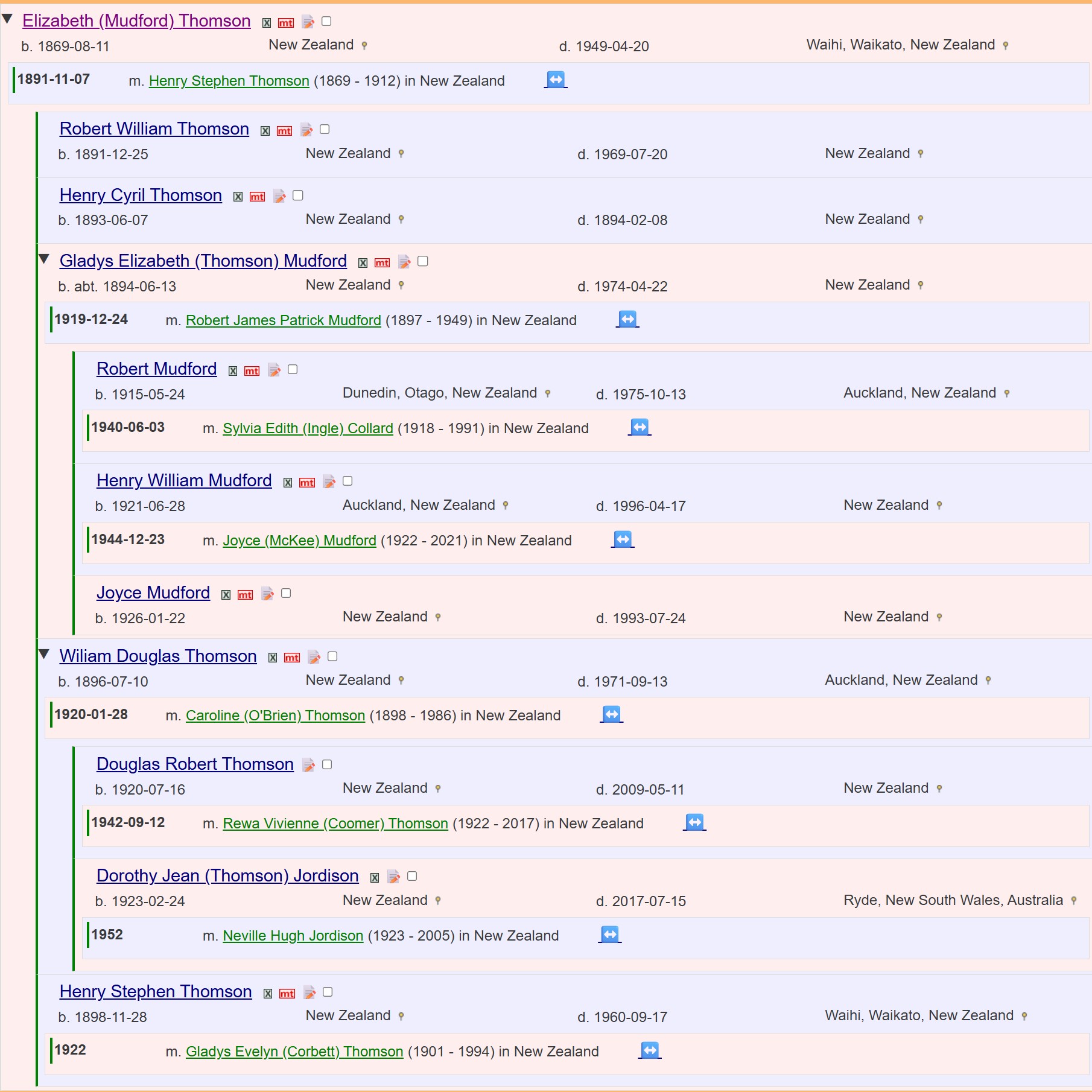Elizabeth (Mudford) Thomson was born the 11'th August 1869 and died on 20'th April 1949 and is buried at Waikumete Cemetery in Auckland.