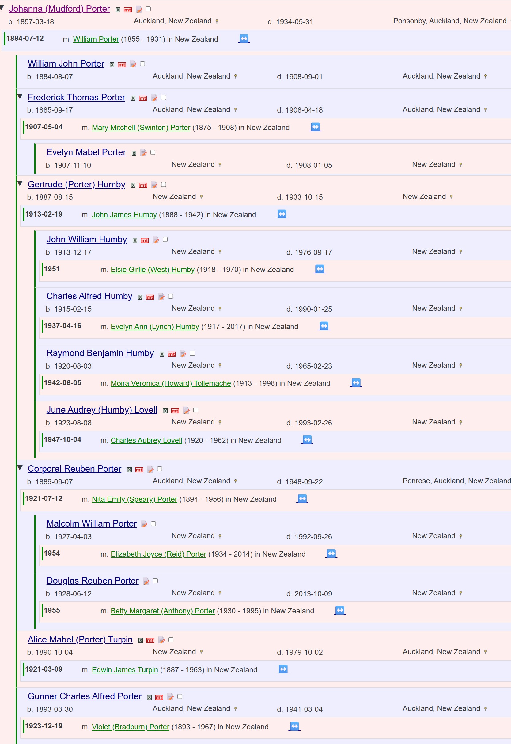 She married William Porter (b. 1855, d. 1931) on the 12'th July 1884. Johanna and William had six children: William John Porter (b. 1884, d. 1908), Frederick Thomas Porter (b. 1885, d. 1908), Gertrude (Porter) Humby (b. 1887, d. 1933), Reuben Porter (b. 1889, d. 1948), Alice Mabel (Porter) Turpin (b. 1890, d. 1979), and Charles Alfred Porter (b. 1893, d. 1941). Their two eldest boys both died in 1908. William John Porter, who was still single, seems to have died suddenly on a fishing trip. While His younger brother, Frederick Thomas died in hospital. Frederick Thomas and his wife Mary Mitchell (Swinton) Porter (b. 1875) had a daughter Evelyn Mabel Porter (b. 1907, d. 1908) who died at 8 weeks of age.